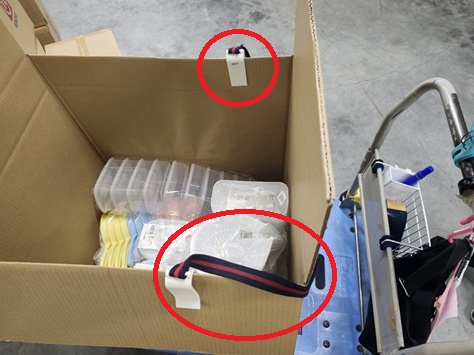 異物とはダンボールの「フタ」部分が閉じてしまわないように留めておく「大型のクリップ」。